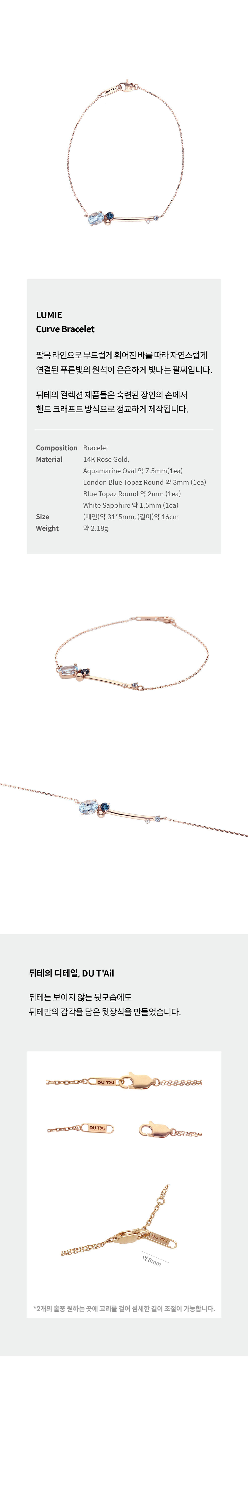 팔목 라인으로 부드럽게 휘어진 바를 따라 자연스럽게 연결된 푸른빛의 원석이 은은하게 빛나는 팔찌입니다.