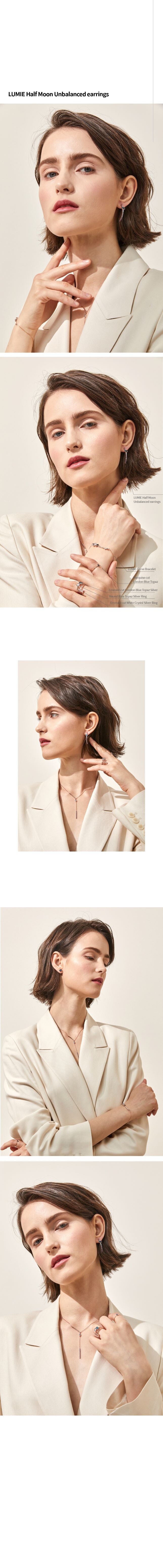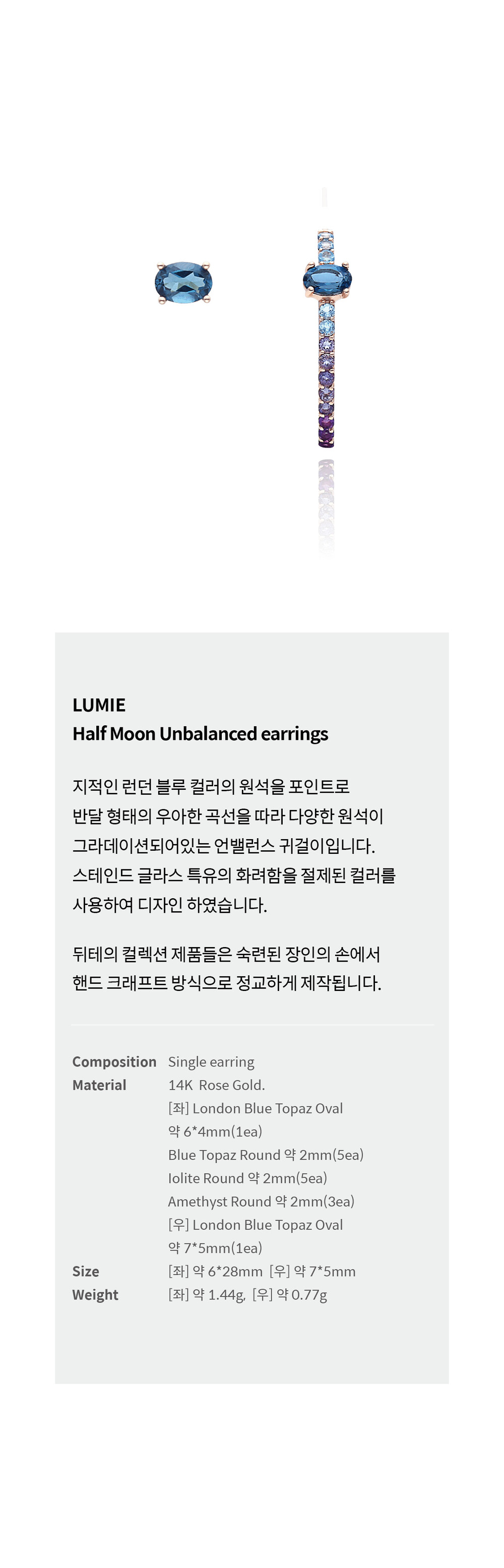 지적인 런던 블루 컬러의 원석을 포인트로 반달 형태의 우아한 곡선을 따라 원석 그라데이션되어있는 언밸런스 귀걸이입니다.