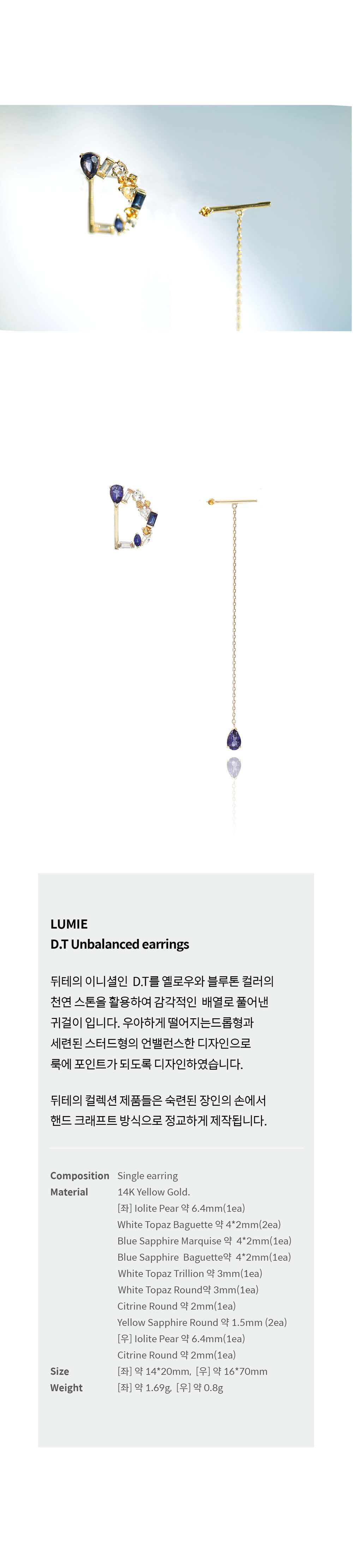 뒤테의 이니셜인 D.T를 옐로우와 블루톤 컬러의 천연스톤을 활용하여 감각적인 배열로 풀어낸 귀걸이입니다. 우아하게 떨어지는 드롭형과 세련된 스터드형의 언밸런스한 디자인으로 룩에 포인트가 되도록 디자인하였습니다.
