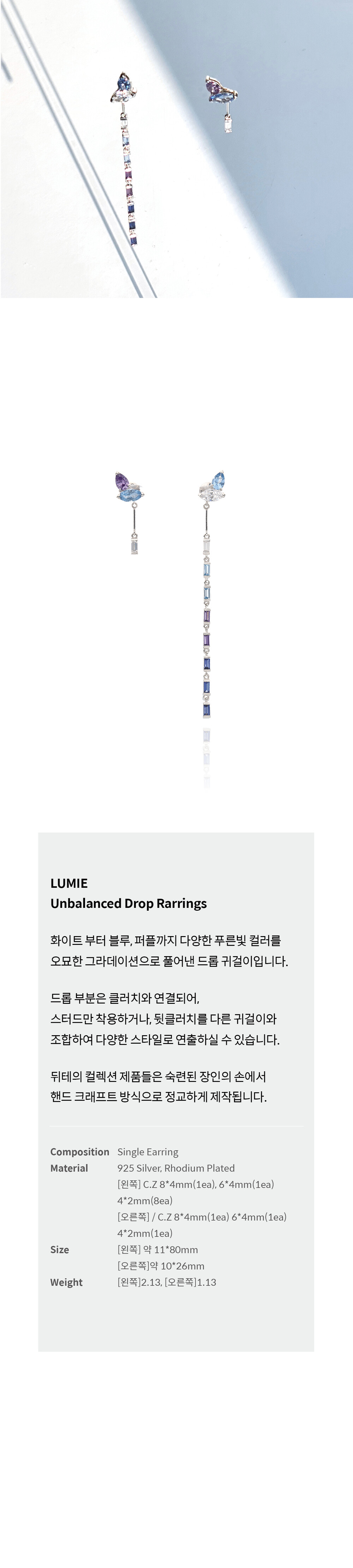 화이트부터 블루, 퍼플까지 다양한 푸른빛 컬러를 오묘한 그라데이션으로 풀어난 드롭 귀걸이입니다.