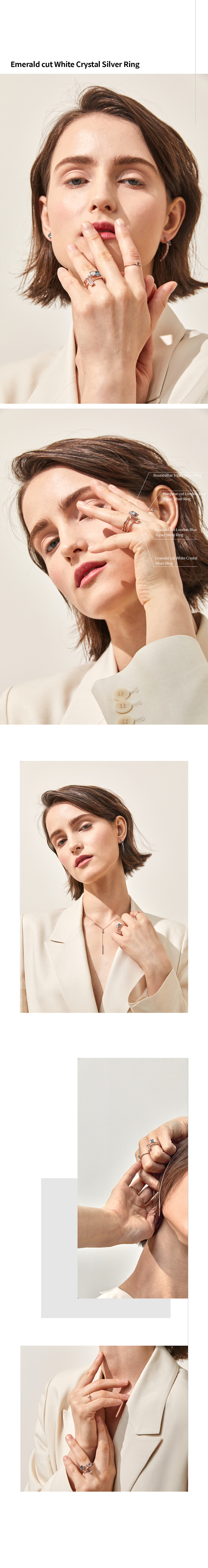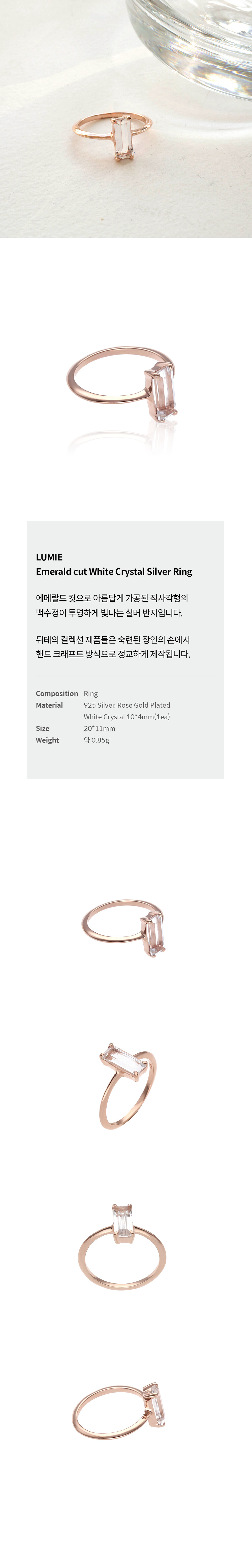 에메랄드 컷으로 아름답게 가공된 직사각형의 백수정이 투명하게 빛나는 실버 반지입니다.